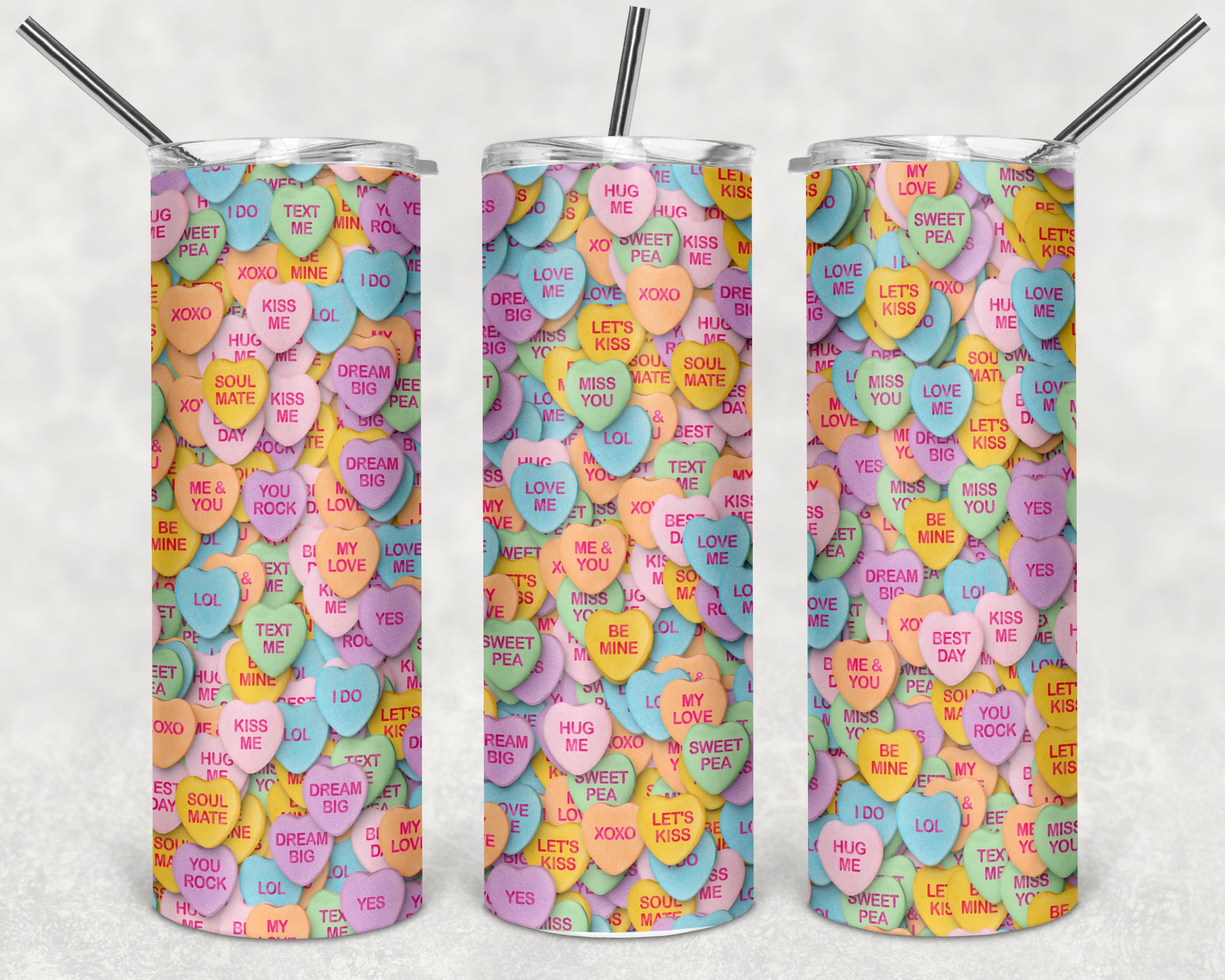 The exterior of the tumbler likely showcases an array of colorful and pastel conversation hearts, each adorned with playful messages like "Love You," "XOXO," or "Be Mine." The hearts may be arranged in a visually appealing pattern, creating a cheerful and celebratory vibe. The color palette is likely to include shades of pink, purple, blue, and other romantic hues.