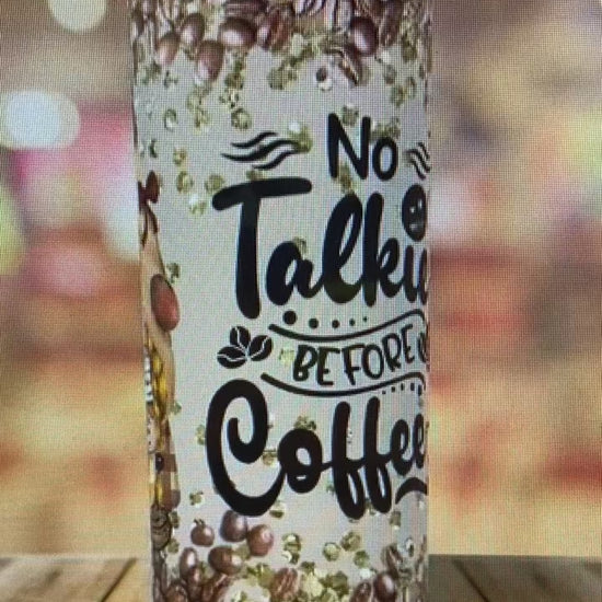 No need to sacrifice your morning routine with our "no talkie til my coffee" 20 oz tumbler! Keep your coffee hot and your conversations minimal. Stay on track and fuel your day with this stylish, insulated tumbler. Don't let anything interrupt your caffeine fix.
